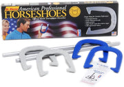 The set includes 4 forged steel American horseshoes (2 blue and 2 gray), 2 solid steel stakes (24 inches), an official rulebook, and a durable nylon tote bag.