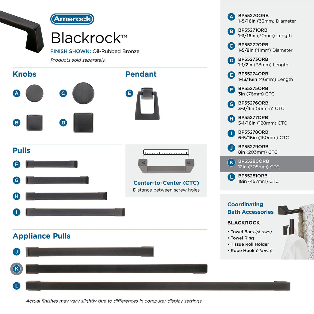 The Amerock Bp55280Orb Blackrock 12 In (305 Mm) Center-To-Center Appliance Pull Is Finished In Oil-Rubbed Bronze. The Blackrock Collection Offers Sleek Simplicity With A Contemporary Indulgence. This Eclectic Line Boasts Bold Shapes And Sizes. The Oil-Rubbed Bronze Finish Is A Rich, Dark Brown Old World Finish With Striking Light And Dark Accents. Amerock Offers A Complete Line Of Decorative And Functional Cabinet Hardware, Bath Hardware, Hook And Rail And Wall Plates. Amerock? Award-Winning Decorative And Functional Hardware Solutions Have Built The Company? Reputation For Chic Design Accessories That Inspire Homeowners To Express Their Personal Style. Available In A Variety Of Finishes And Styles, Amerock Offers High Quality Designs At Affordable Prices. Always Creating. Always Timeless. Always Amerock.