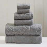 A Beautifully Crafted Towel Set With A Geometric Jacquard Design Paired With A Solid Terry Towel For The Perfect Set The Name Describes The Jacquard Design In Great Detail A Diamond Gate Motif Inspired By The Rod Iron Gates Surrounding Some Of The Most Elegant Homes In The World The Solid Terry Set Has A Structured Double Ribbed Banding That Repeats On The Edge Of The Bath, And Wash Adding A Nice Foundation To The Set, With A Twill Design On The Hem Edge
