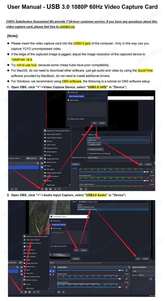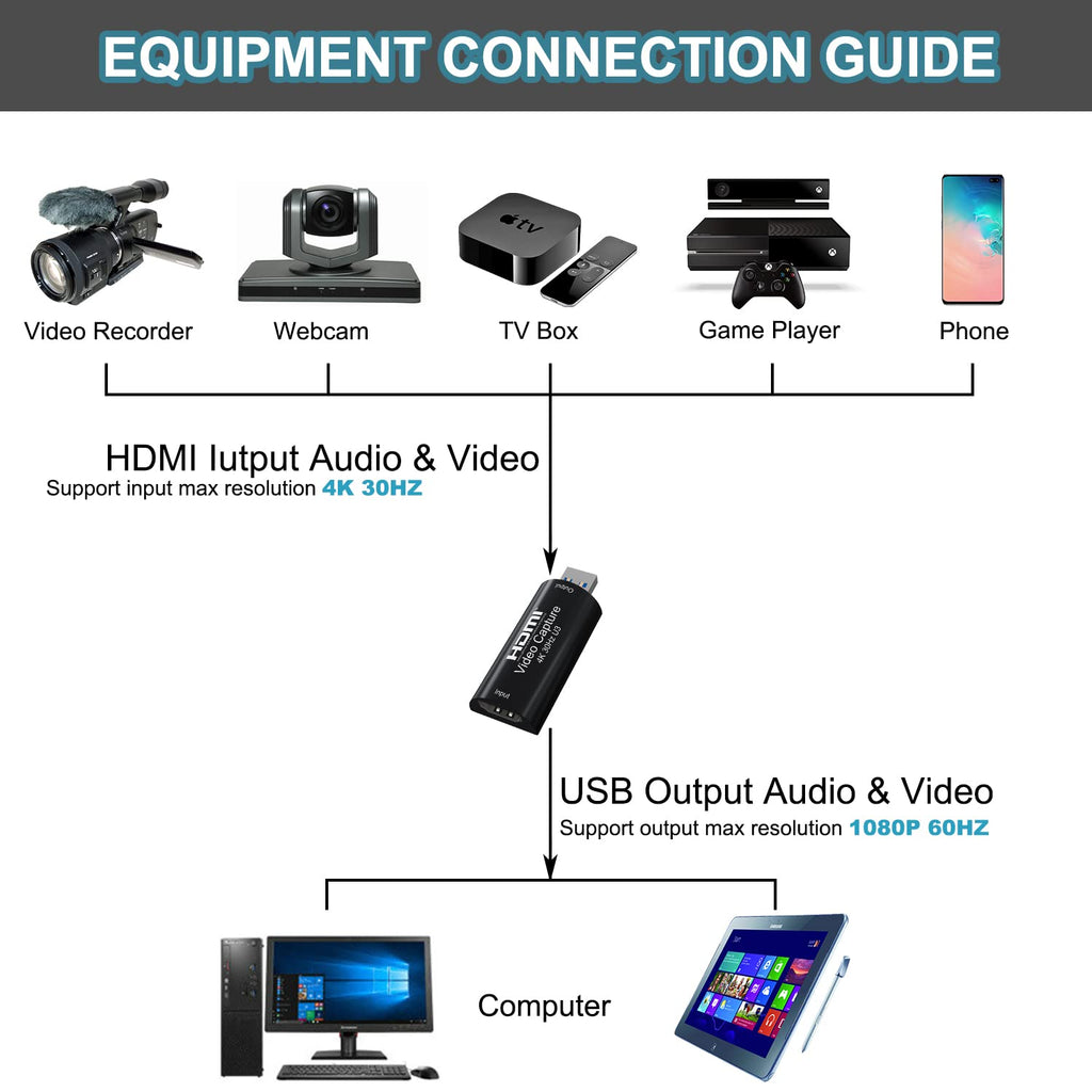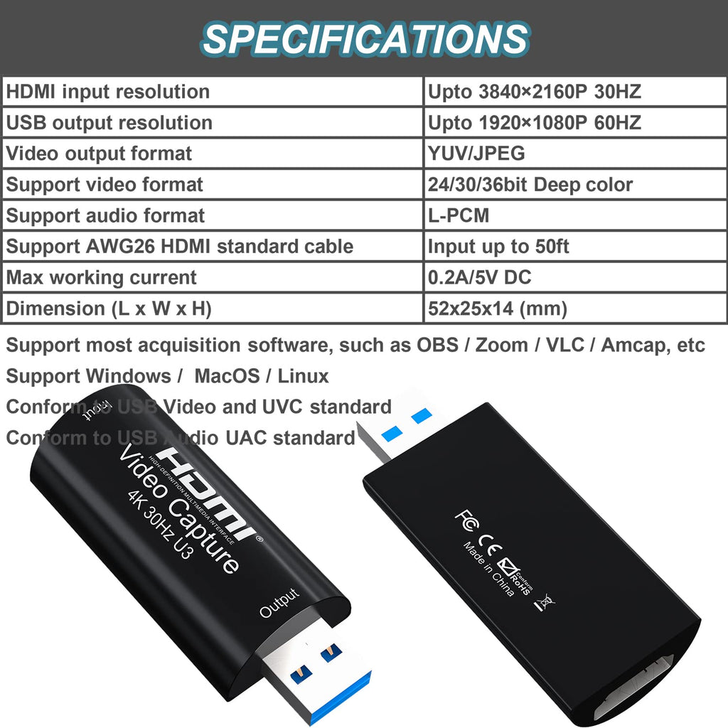 AMZHRLY UPGRADED USB3.0 1080P 60Hz Video Capture Card can collect HDMI audio and video, it uses multi-layer circuit protection for better anti-static and heat dissipation. [Note]: -- For MacOS, do not need to download other software. just get audio and video by using the QuickTime software provided by MacBook, do not need to install additional drivers. -- For Windows, we recommend using OBS software, then download the User Manual (PDF) on the current product description page or ask the seller for it. -- Please insert the video capture card into the USB3.0 jack of the computer. Only in this way can you capture YUY2 uncompressed video. -- If the edge of the captured image is jagged, adjust the image resolution of the captured device to 1080P/4K 16:9. -- Try not to use hub, because some cheap hubs have poor compatibility. Features: HDMI Input resolution 4K 30FPS USB output resolution 1080P 60FPS Video output format: YUV/JPEG Support video format: 24/30/36bit Deep color; audio format: L-PCM Support most acquisition software, such as VLC / OBS / Amcap, etc Support Windows / Android / MacOS Conform to USB Video and UVC standard; USB Audio UAC standard Max working current: 0.2A/5V DC Dimension (L * W * H): 52x25x14 (mm) Without external power supply No need to install additional drivers. Connection and Operation: 1: Connect the UHD signal source to the HDMI input of the video capture with one HDMI cable. 2: Connect the computer to the usb port of the video capture with usb cable. 3: Operation steps for USB video capture(OBS): Open OBS, click +->Video Capture Device, select USB3.0 UHD in Device; click +->Audio Input Capture, select Microphone in Device; click Start Recording . Package including: Audio Video Capture Cards 1PCS USB3.0 extension cable 1PCS User Manual 1PCS