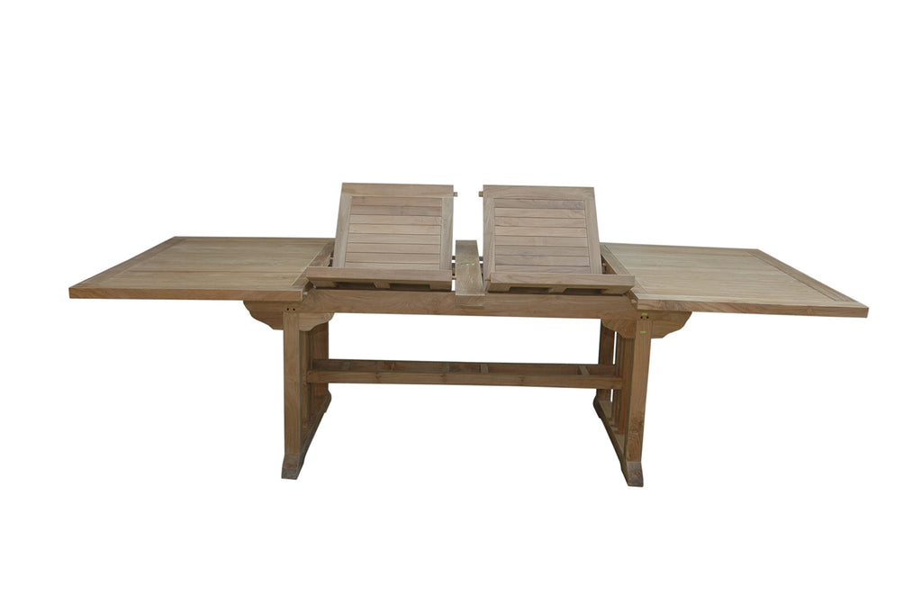 This Solid Teak ''Sahara Rectangular Double Extension Table'' Makes The Perfect Addition To Your Patio Or Backyard. The Unique Built-In Butterfly Pop-Up Leaf Enables You To Open And Close Your Table In Less Than 15 Seconds. The Leaf Folds Away For Easy Storage. This Table Stands 29'' High And Is 43'' Width By 74'' Long And If Fully Extended Can Reach Opening To 106'' Long. The Table Can Be Extend With 1 Or 2 Leaves, Seats 10 To 12 People Comfortably. Available With Umbrella Hole. After All, It Is Perfect For Your Party Family And Friends Gathering.