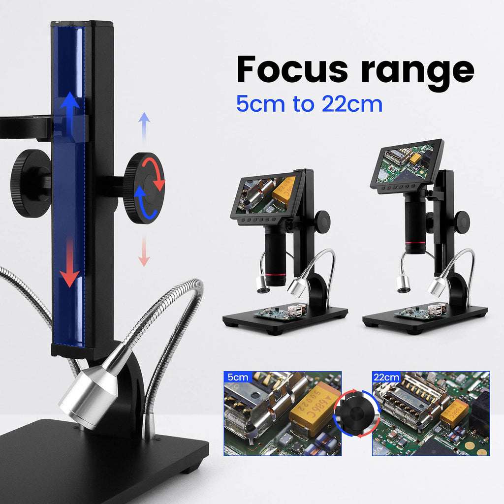 Screen size 5 inch Image sensor 3 Mega Pixels HD Sensor Video output 1080P Full HD (via HDMI) ;720P (via PC) Video format real time play via HDMI w/o recording; MJPEG recording via PC Software Magnification Up to 560 times (HDMI monitor 22 inch) Photo resolution 12M Photo format JPEG Focus range 5cm to 22cm Frame rate Max 30f/s under 600 Lus Brightness Video-output interfaceHDMI/AV Storage Micro-SD card, up to 32G Power source5V DC Light source2 LED with the stand Package contents microscope 1 metal stand 1 USB cable 1 HDMI cable 1 adapter 1 IR remote control 1 will send instructions and software by email
