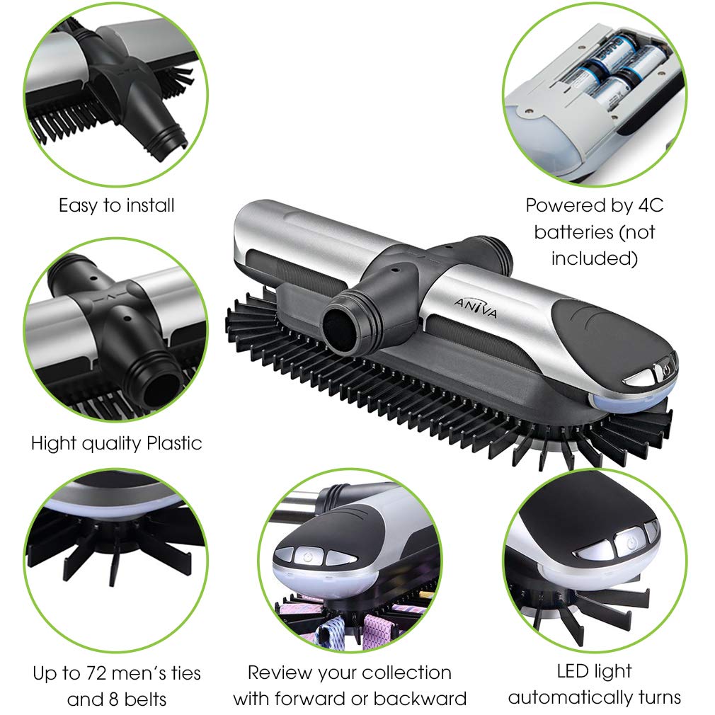 Best Motorized Tie Rack Closet OrganiserThis electronically rotating tie rack by Aniva is the best choice among men everywhere because it is super neat and incredibly convenient!It is designed with a multi-directional carousel that organizes, stores and displays more than 70 men's neck ties and 8 belts. When it's time to choose a tie or belt to wear for the day, simply push the button and the carousel will slowly rotate in order to allow you to review your collection.Another feature which sets our motorized tie rack apart from others is that it is extremely easy to install. Each automatic tie rack comes with a heavy duty clamp which is used to attach it to any standard-sized closet rod. Four C batteries are required to use the motorized feature. (Batteries are not included)This battery-operated tie rack makes a wonderful gift idea for any man in your life including your husband, dad, father-in-law, brother or uncle for special occasions such as birthdays, Fathers Day Gifts and more!Dimensions: 16.1long, 5.1high, 7.6wideGreat Gift Idea! Motorized Carousel Holds up to 72 Men's Ties and 8 Belts Battery Operated Built-In LED Lights Easy To Install 100% CUSTOMER SATISFACTION GUARANTEEDClick 'Add to Cart' to order your own motorized tie rack by Aniva today!