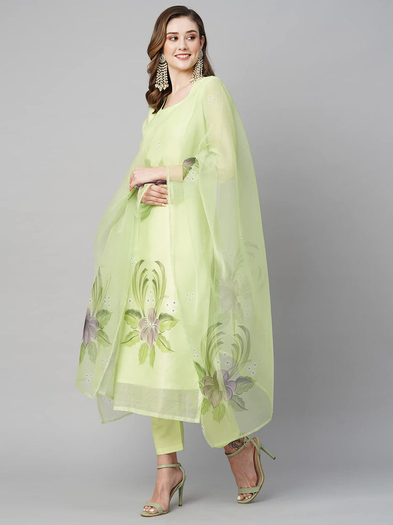 Anni Designer Women'S Chanderi Cotton Straight Printed Kurta With Pant & Dupatta (Idika Green-Nw_L_Green_Large),Green,L,Cotton Blend,Regular,Kurta, Scarf