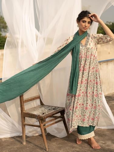Anni Designer Women'S Cotton Blend Anarkali Printed Kurta With Pant & Dupatta (Toki White-Nw_M_White_Medium),White,M,Cotton Blend,ANNI DESIGNER Women's Cotton Blend Anarkali Printed Kurta with Pant & Dupatta (TOKI WHITE-NW),