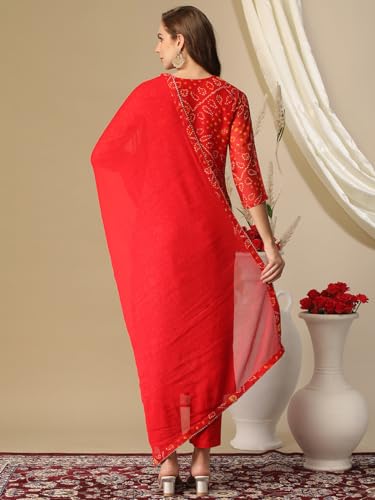 Anni Designer Women'S Cotton Blend Bandhani Printed Straight Kurta With Pant & Dupatta (Turae-Red-Nw_M_Red_Medium),Red,M,Cotton Blend,Regular,
