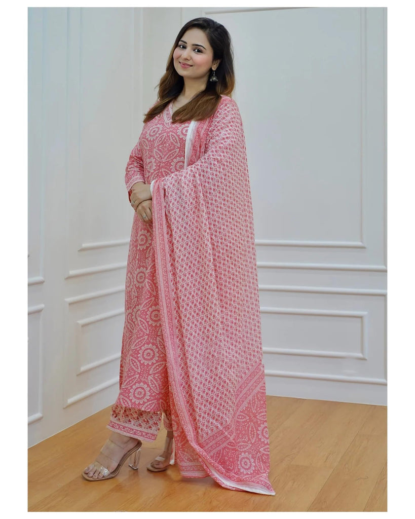 The ANNI DESIGNER Women's Cotton Blend Kurta Set includes one kurta, one pair of pants, and one dupatta.