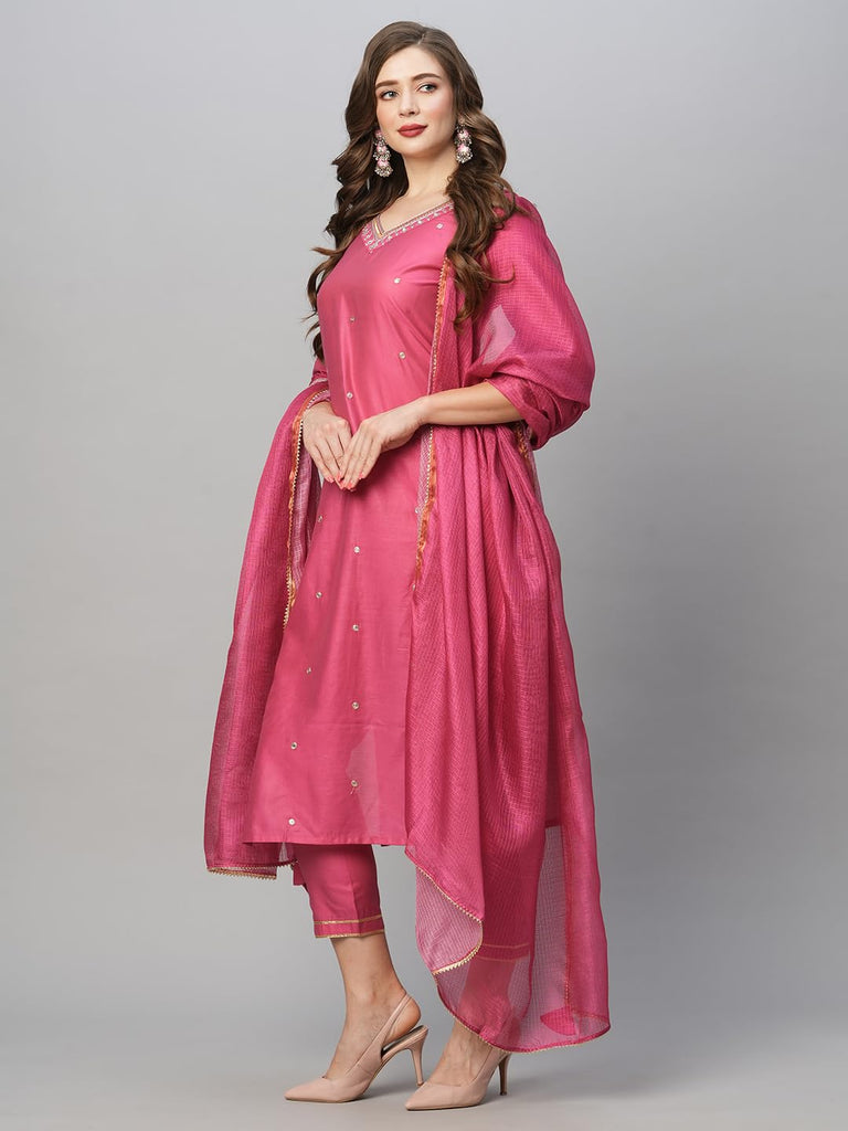 Anni Designer Women'S Cotton Blend Embroidered Straight Kurta With Pant & Dupatta (Bagicha-Rani-Fnw_Xl_Pink_X-Large),Pink,XL,Cotton Blend,Regular,Dupatta