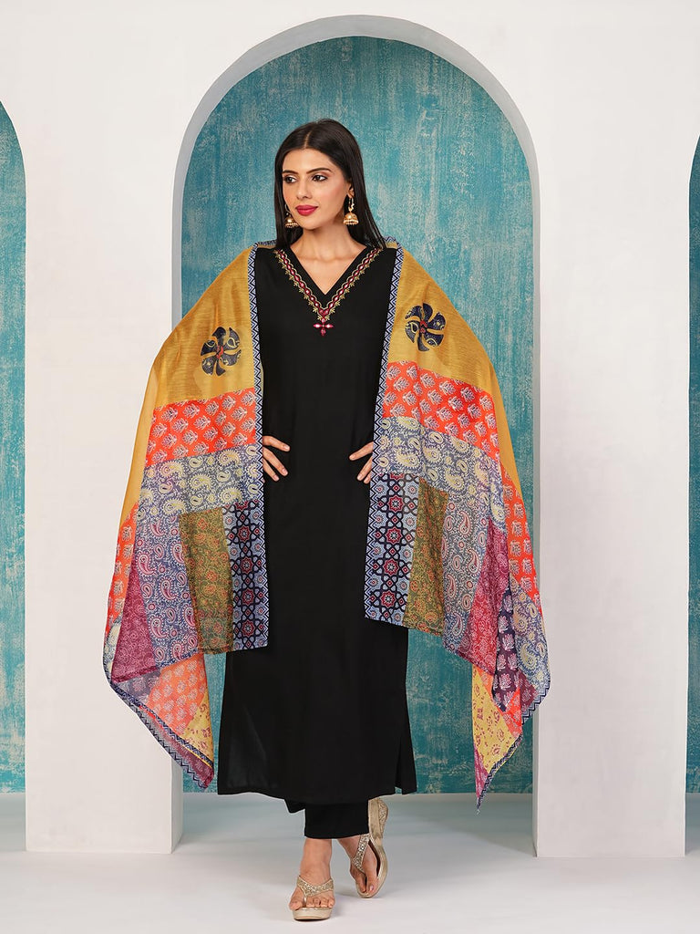 Anni Designer Women'S Cotton Blend Embroidered Straight Kurta With Pant & Dupatta (Fronx Black-Nw_L_Black_Large)