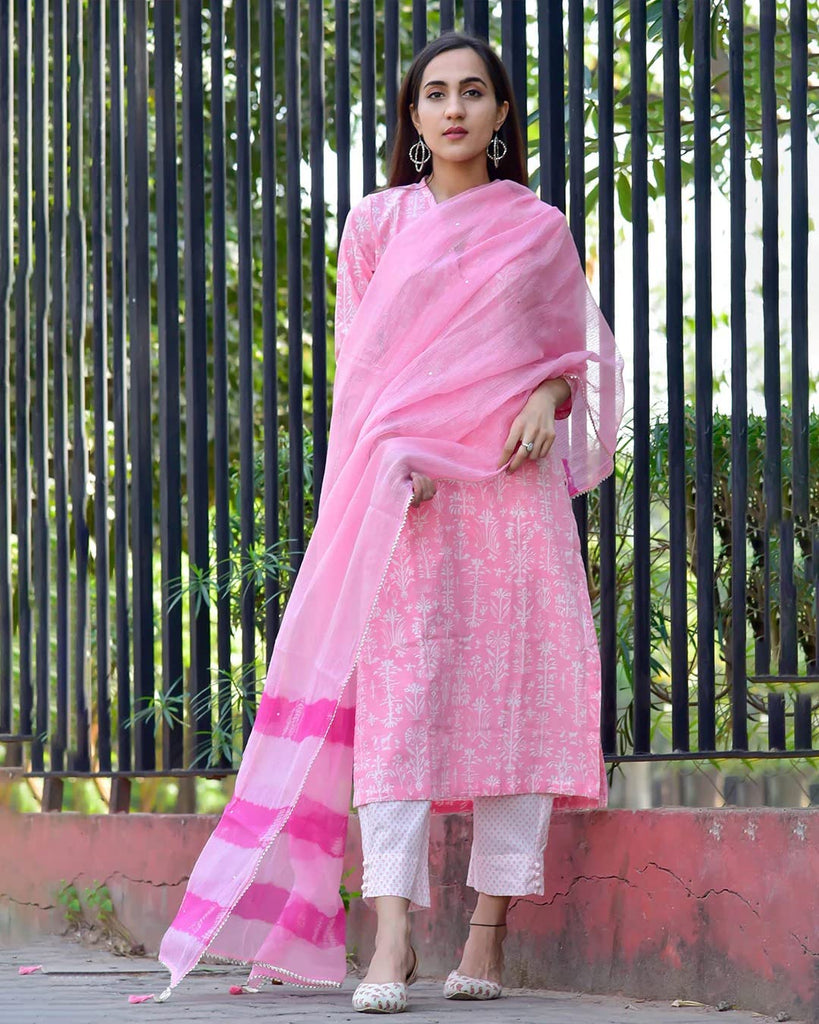Descriptionanni Designer Women'S Cotton Blend Floral Printed Straight Kurta With Pants & With Dupatta (Bagru-Pink_L_Pink_Large)