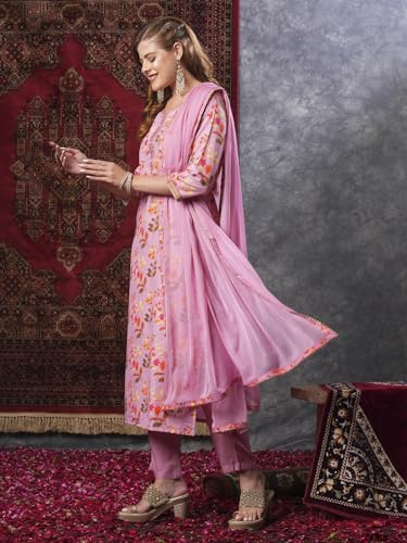 Anni Designer Women'S Cotton Blend Printed Straight Kurta And Pant With Dupatta (Kaleping-Pink_M_Pink_Medium),Pink,M,Cotton Blend,Regular,