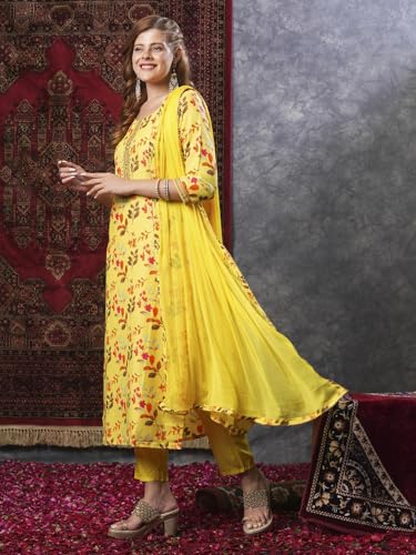 Anni Designer Women'S Cotton Blend Printed Straight Kurta And Pant With Dupatta (Kaleping-Yellow_5Xl_Yellow_Xxxxx-Large),Yellow,5XL,Cotton Blend,Regular,