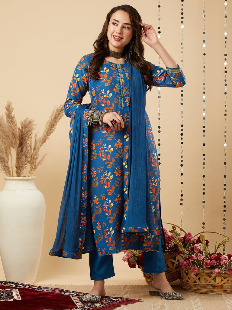 Anni Designer Women'S Cotton Blend Printed Straight Kurta And Pant With Dupatta Set (Kaleping-Kerosin-Nw_M_Dark Blue_Medium),Dark Blue,M,Cotton Blend,Regular,