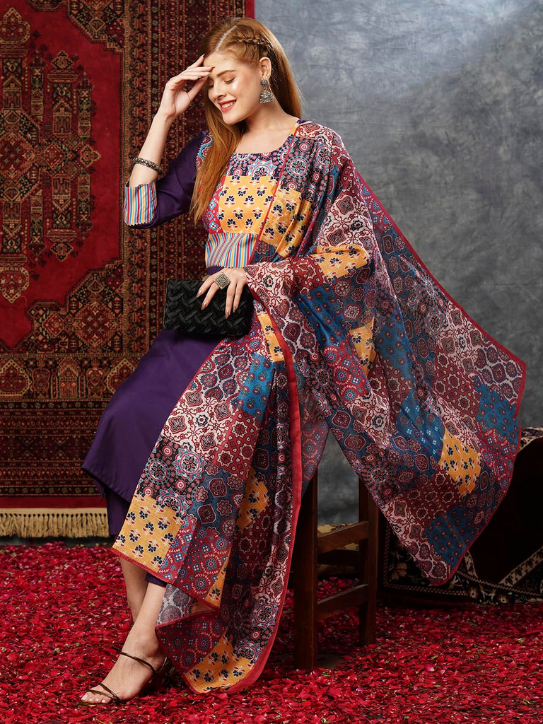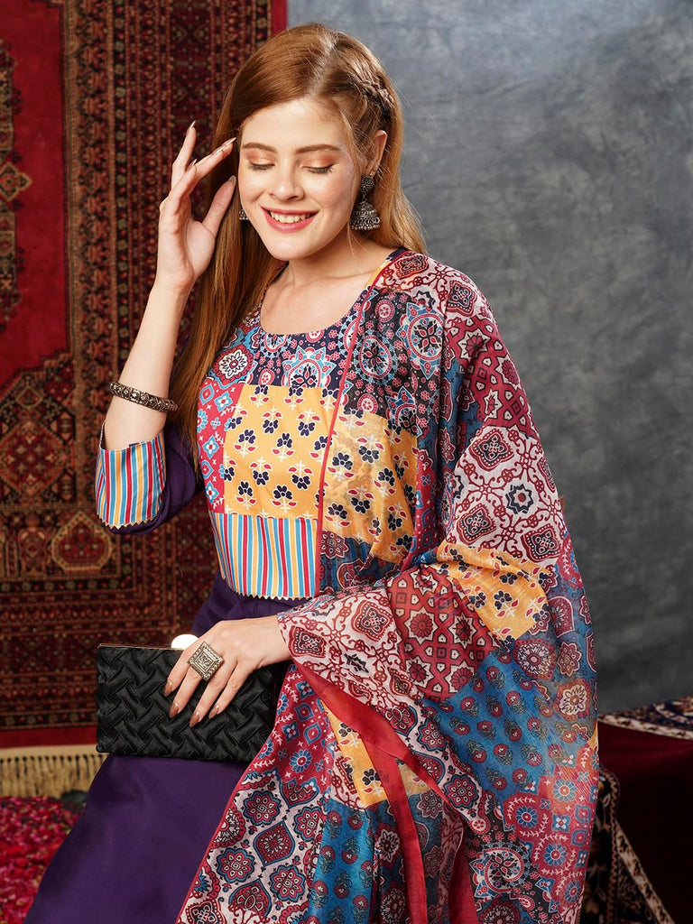 Anni Designer Women'S Cotton Blend Printed Straight Kurta With Pant & Dupatta (Gaazi-Begani-Jl_L_Violet_Large),Violet,L,,,