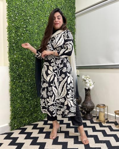 Anni Designer Women'S Cotton Blend Printed Straight Kurta With Pant & Dupatta (Jasper Black_4Xl_Black_Xxxx-Large),Black,4XL,Cotton Blend,Regular,