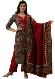 Anni Designer Women'S Cotton Blend Printed Straight Kurta With Pant & Dupatta (Makshi Red_S_Red_Small),Red,S,Cotton Blend,Regular,Kurta with Bottomwear & Dupatta