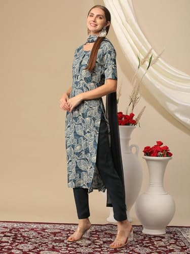 Anni Designer Women'S Cotton Blend Printed Straight Kurta With Pant & Dupatta (Minika Blue_M_Blue_Medium),Blue,M,Cotton Blend,Regular,Kurta, Scarf
