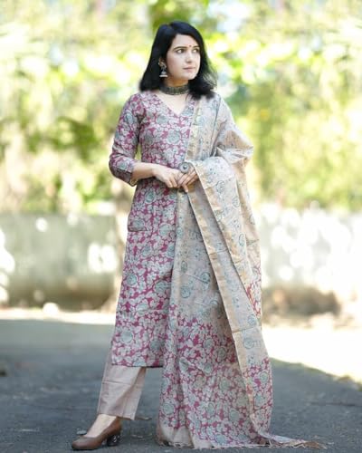 Anni Designer Women'S Cotton Blend Printed Straight Kurta With Pant & Dupatta (Moringa Pink_Xl_Pink_X-Large),Pink,XL,Cotton Blend,Regular,