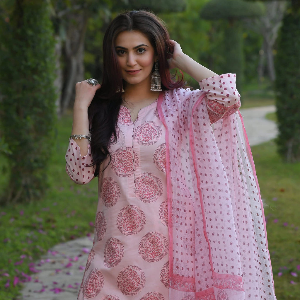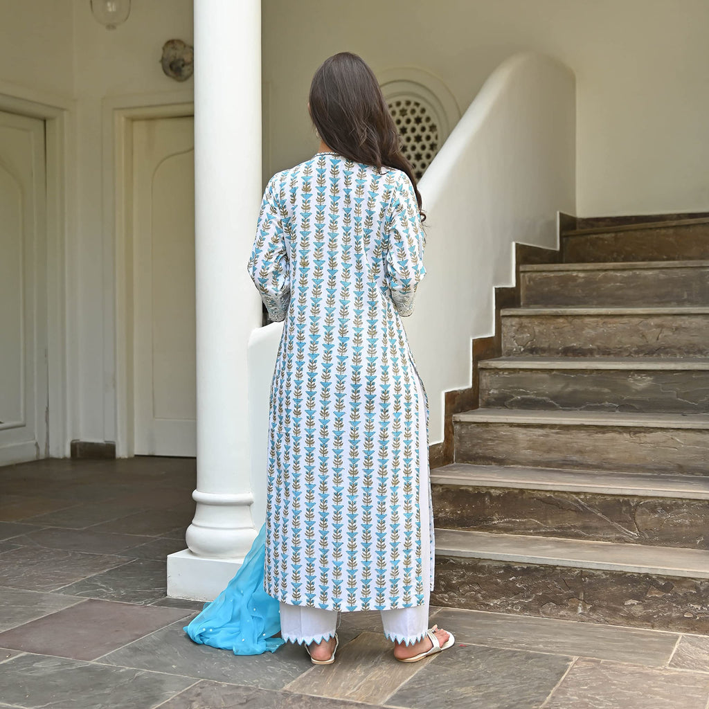 Anni Designer Women'S Cotton Blend Printed Straight Kurta With Pant & Dupatta Pack Of 2 (Combo-Chhapa-Pink-April-Sky Blue_L_Multi_Large)