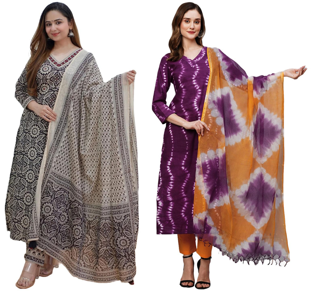 Anni Designer Women'S Cotton Blend Printed Straight Kurta With Pant & Dupatta Pack Of 2 (Combo-Nihira Cream-Mukhi Pink_M_Multi_Medium)