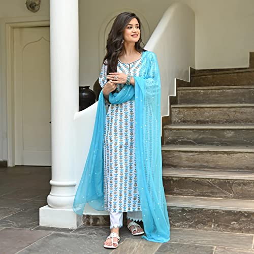 Anni Designer Women'S Cotton Blend Printed Straight Kurta With Pant & Dupatta Pack Of 2 (Combo-Prem Pink-April-Sky Blue_Xxl_Multi_Xx-Large),Multicolour,2XL,Cotton Blend,Regular,
