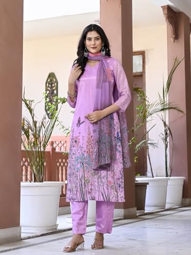 Anni Designer Women'S Cotton Blend Printed Straight Kurta With Pant & Dupatta (Rml Purple_M_Purple_Medium),Purple,M,Cotton Blend,Regular,
