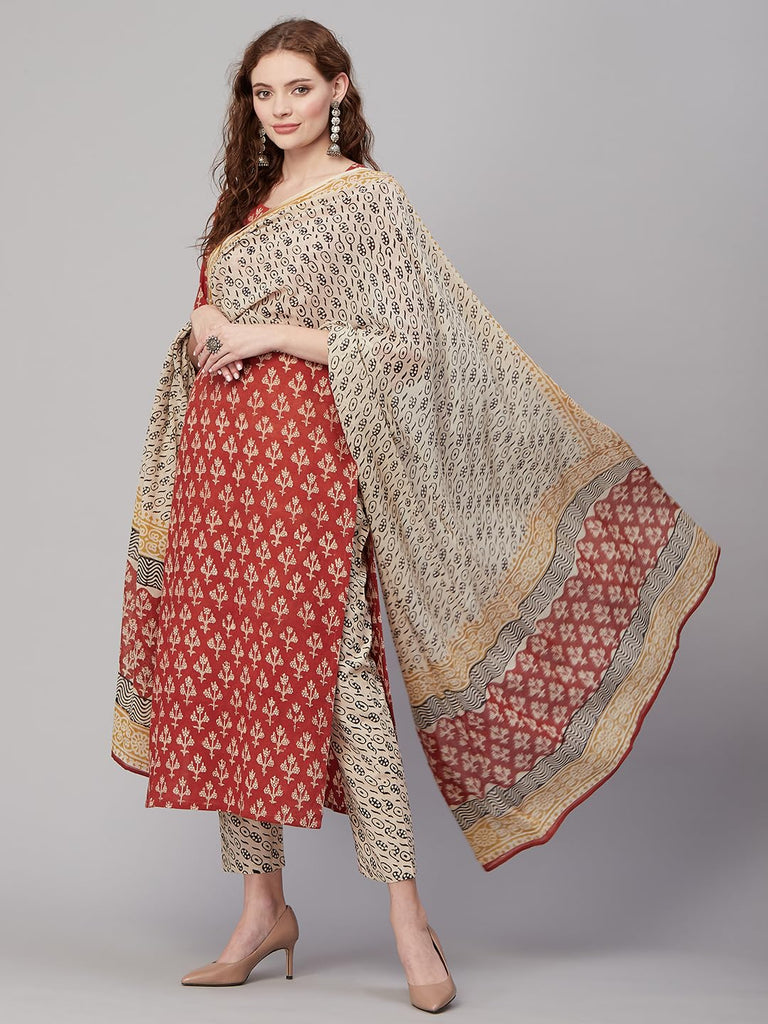 Anni Designer Women'S Cotton Blend Printed Straight Kurta With Pant & Dupatta (Usmi-Maroon_Xl_Maroon_X-Large),Maroon,XL,Cotton Blend,Regular,Dupatta