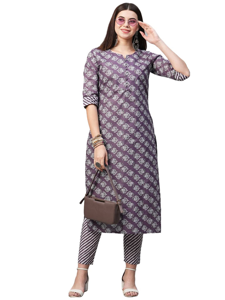 Anni Designer Women'S Cotton Blend Printed Straight Kurta With Pant (Funnu Purple_L_Purple_Large),Purple,L,Cotton Blend,Regular,Pants