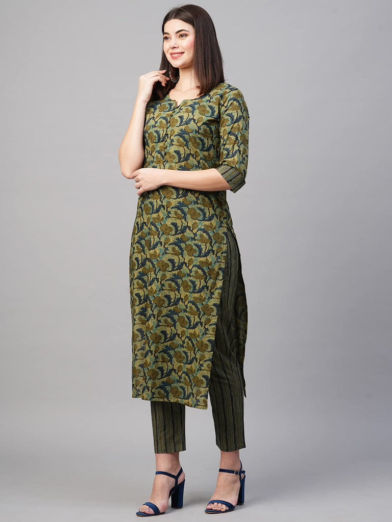 Anni Designer Women'S Cotton Blend Printed Straight Kurta With Pant (Mangla Green_M_Green_Medium),Green,M,Cotton Blend,Regular,Pants