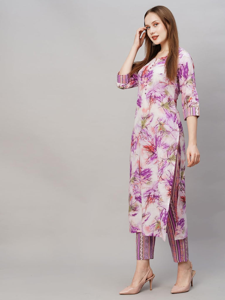 Anni Designer Women'S Cotton Blend Printed Straight Kurta With Pant (Ps-Purple_M_Purple_Medium),Purple,M,Cotton Blend,Regular,Kurta