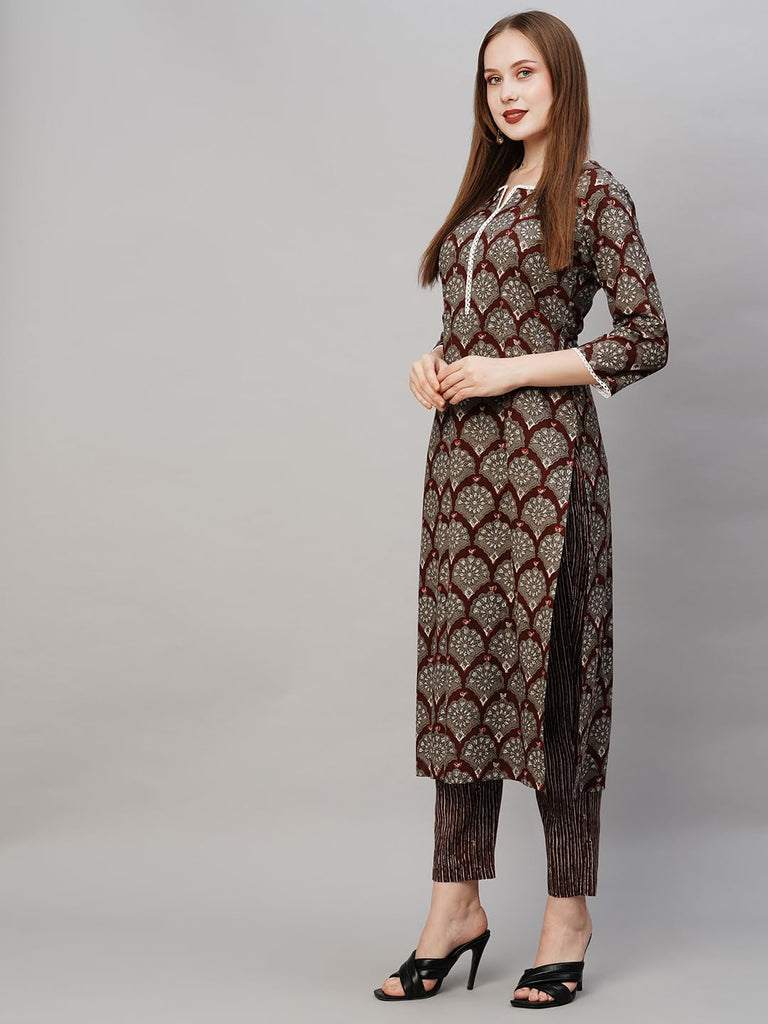 Anni Designer Women'S Cotton Blend Printed Straight Kurta With Pant (Urmi Maroon_S_Maroon_Small),Maroon,S,Cotton Blend,Regular,Kurta