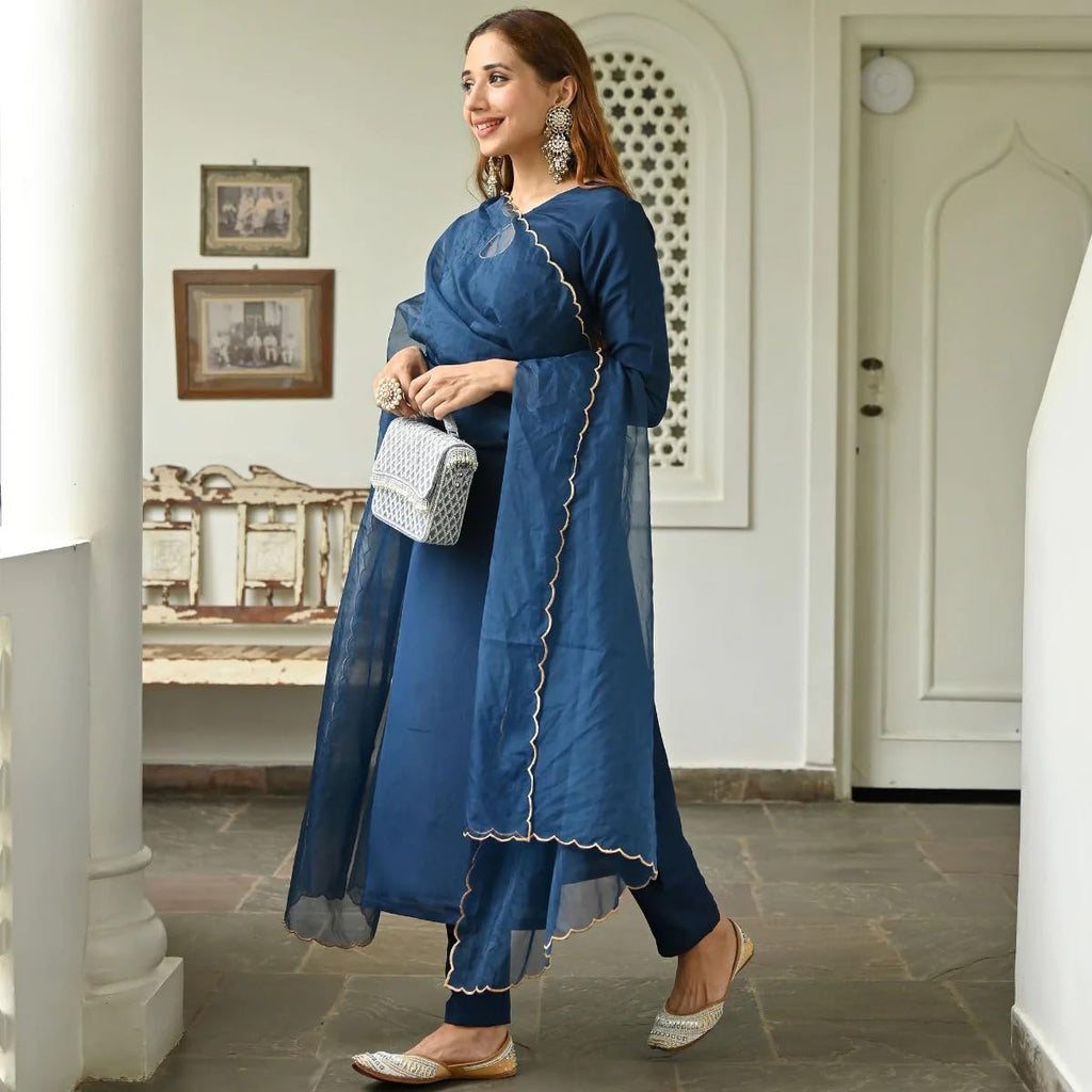 Anni Designer Women'S Cotton Blend Solid Straight Kurta With Pant & Dupatta (Jita Blue_5Xl_Blue_Xxxxx-Large),Blue,5XL,Cotton Blend,Regular,Dupatta