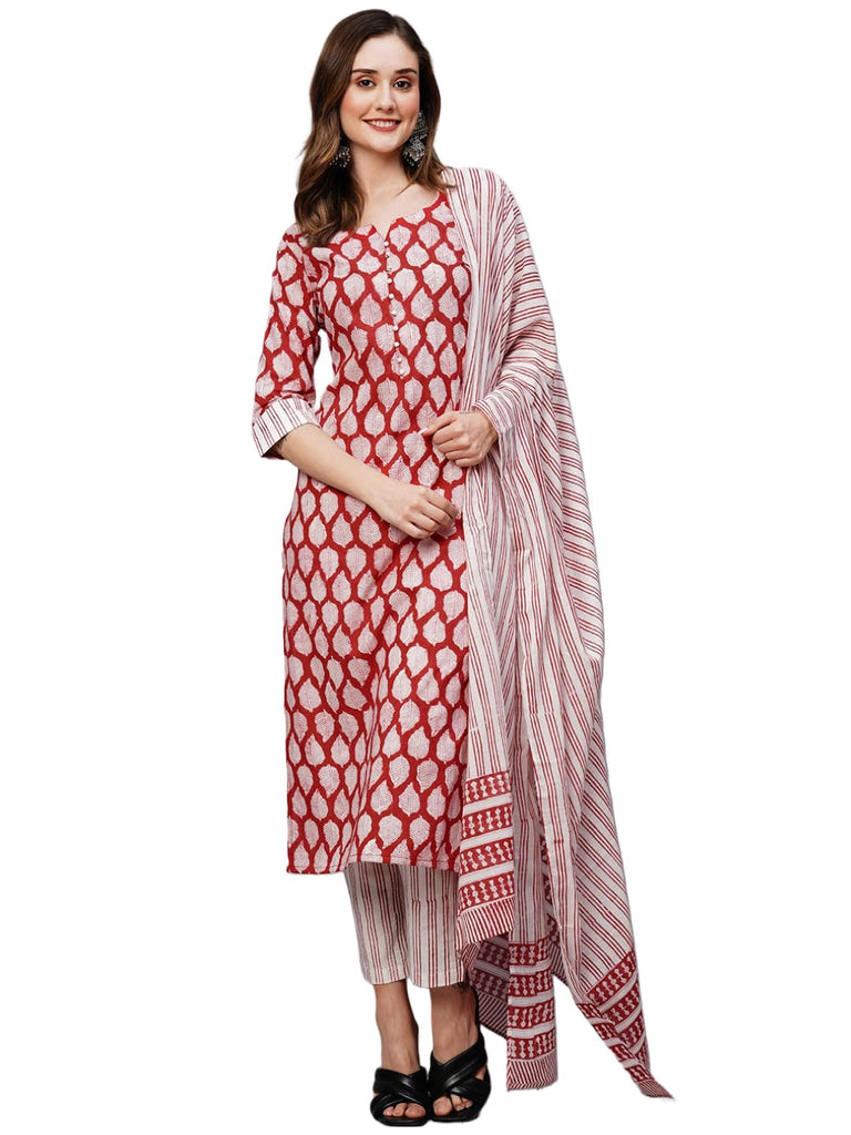 Anni Designer Women'S Cotton Blend Staright Printed Kurta With Pant & Dupatta (Vedavati Red_Xl_Red_X-Large),Red,XL,Cotton Blend,Regular,Dupatta