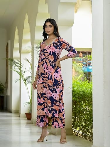 Anni Designer Women'S Cotton Blend Straight Printed Kurta With Palazzo (Chinki Navy_M_Navy_Medium),Navy Blue,M,Rayon Blend,Straight,