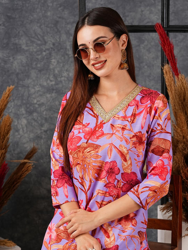 Anni Designer Women'S Cotton Blend Straight Printed Kurta With Palazzo (Chinki Purple-Nw_L_Purple_Large),Purple,L,,,