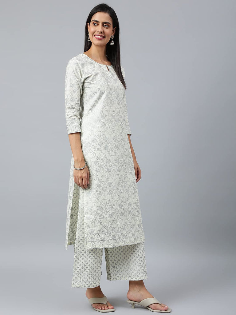 Anni Designer Women'S Cotton Blend Straight Printed Kurta With Palazzo & Dupatta (Suchi Grey_Xl_Grey_X-Large),Grey,XL,Cotton Blend,Straight,Dupatta