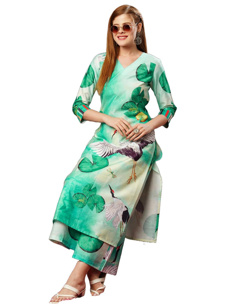 Anni Designer Women'S Cotton Blend Straight Printed Kurta With Palazzo (Swans See Green-Jl_Xxl_See Green_Xx-Large)