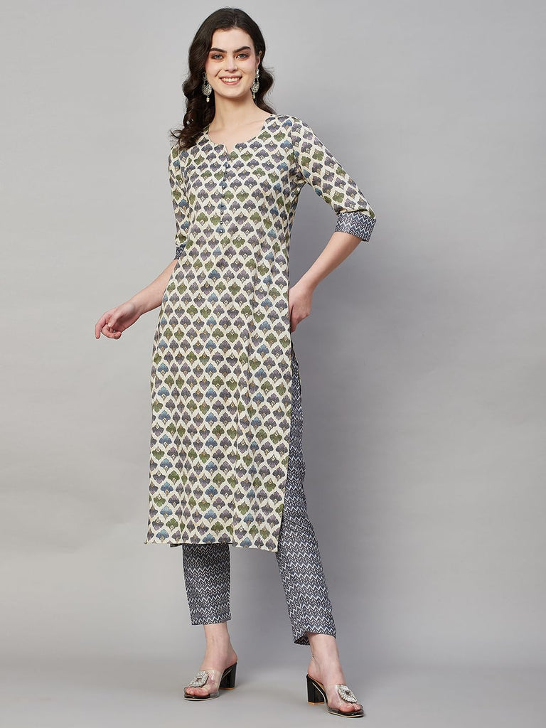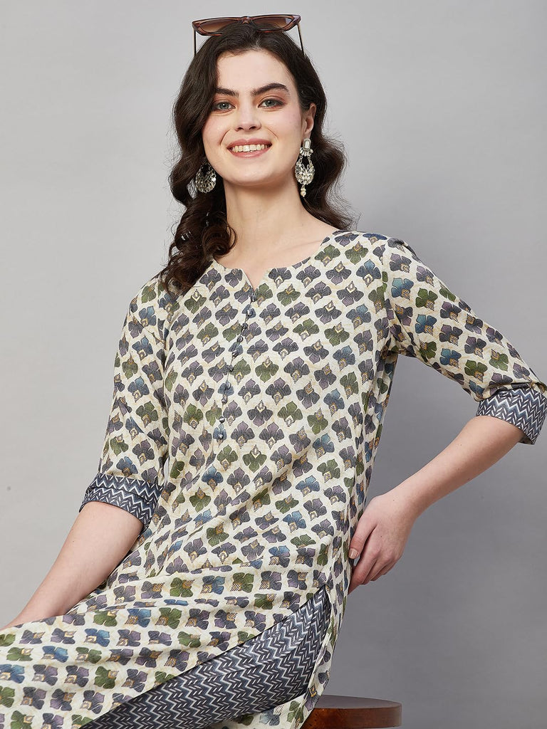 Anni Designer Women'S Cotton Blend Straight Printed Kurta With Pant (B12 Cream_L_Cream_Large),Cream,L,,,