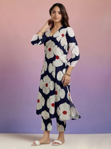 Anni Designer Women'S Cotton Blend Straight Printed Kurta With Pant (Chunilal Blue_M_Blue_Medium),Blue,M,Cotton Blend,Regular,Kurta,Pant