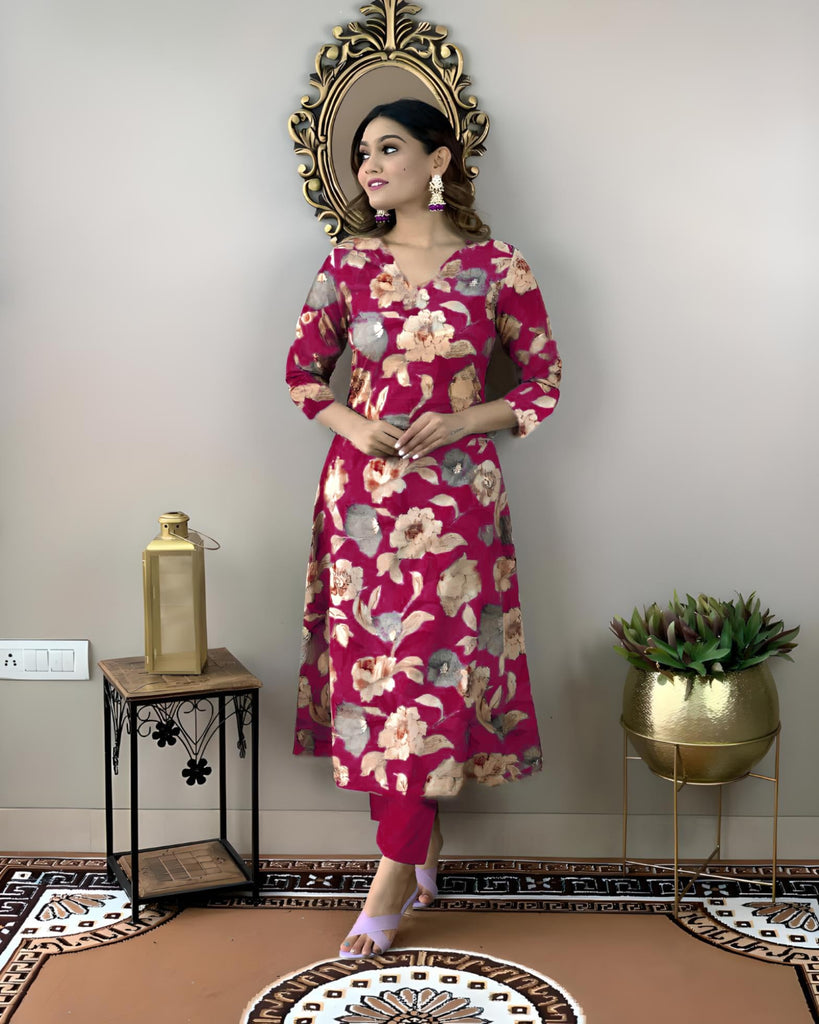 Anni Designer Women'S Cotton Blend Straight Printed Kurta With Pant (Dhun Pink_L_Pink_Large),Pink,L,Rayon Blend,Regular,