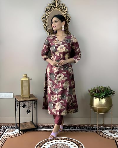 Anni Designer Women'S Cotton Blend Straight Printed Kurta With Pant (Dhun Wine_Xxl_Wine_Xx-Large),Wine,2XL,Rayon Blend,DHUN_1509,Kurta