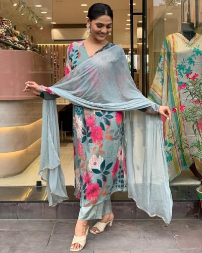 Anni Designer Women'S Cotton Blend Straight Printed Kurta With Pant & Dupatta (Ad312 Green_S_Green_Small),Green,S,Cotton Blend,Regular,