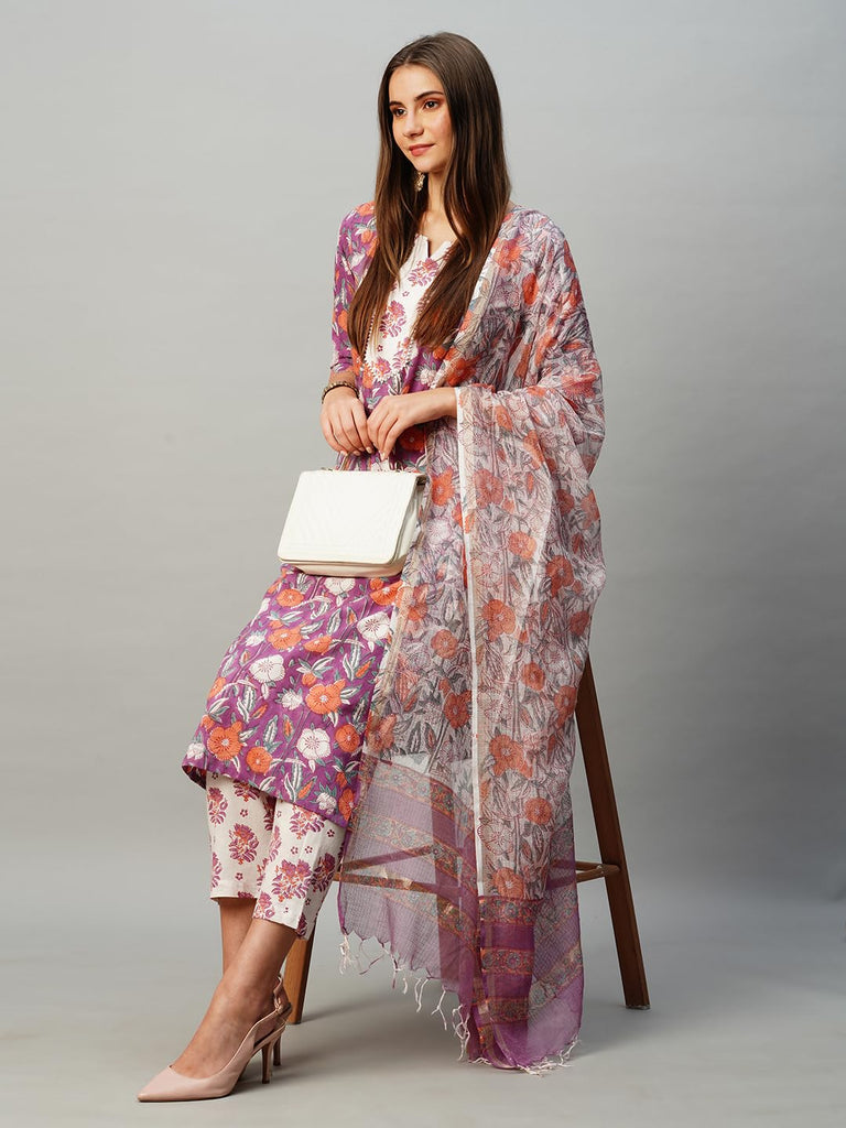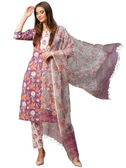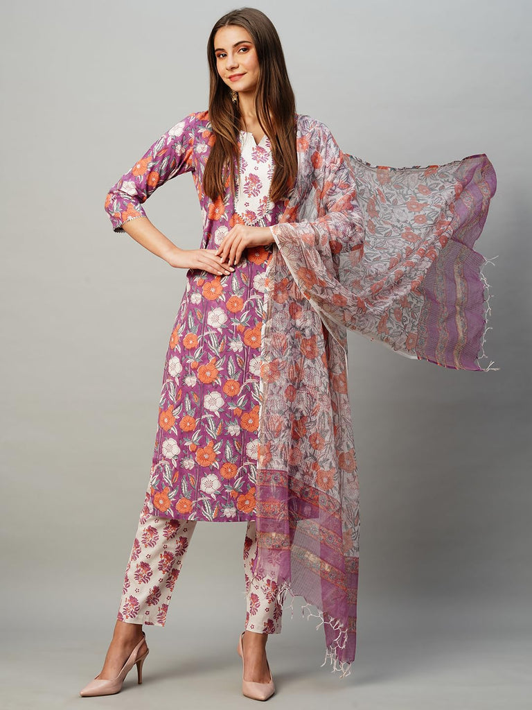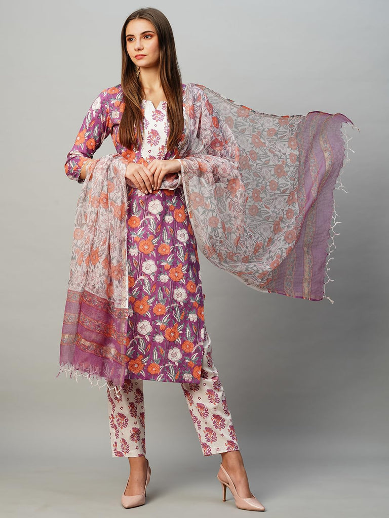 Anni Designer Women'S Cotton Blend Straight Printed Kurta With Pant & Dupatta (Banana Violet-Kbv_Xl_Purple_X-Large),Violet,XL,,,