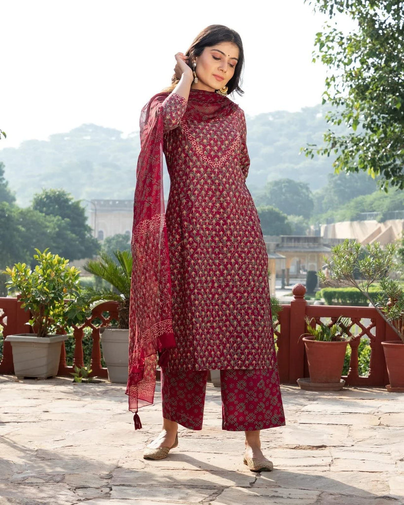 Anni Designer Women'S Cotton Blend Straight Printed Kurta With Pant & Dupatta (Bc Maroon_L_Maroon_Large),Maroon,L,Cotton Blend,Regular,