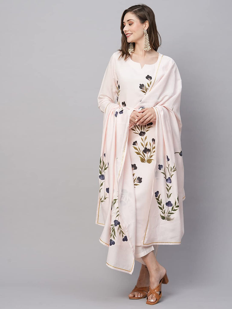 Anni Designer Women'S Cotton Blend Straight Printed Kurta With Pant & Dupatta (Brush-Peach-Tnw_L_Peach_Large),Peach,L,Cotton Blend,Regular,Dupatta