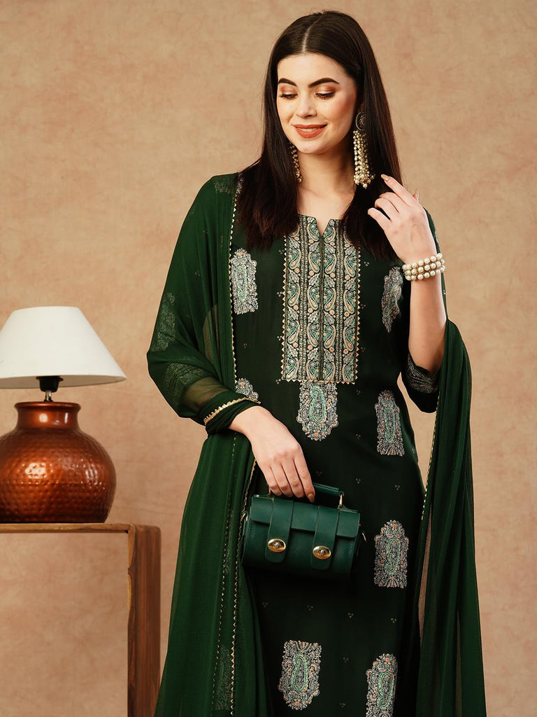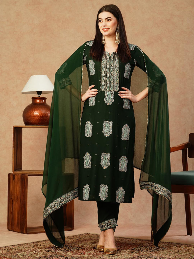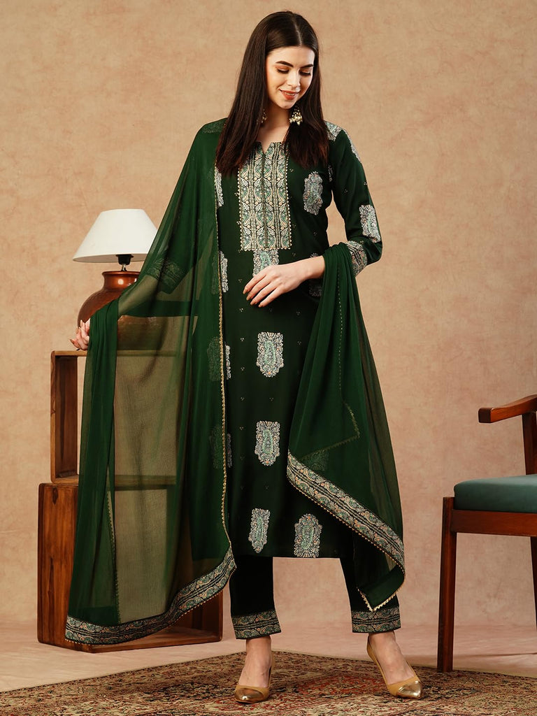 Anni Designer Women'S Cotton Blend Straight Printed Kurta With Pant & Dupatta (Carla Green-Nw_M_Green_Medium)