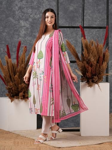 Anni Designer Women'S Cotton Blend Straight Printed Kurta With Pant & Dupatta (Darur Pink_L_Pink_Large),Pink,L,Cotton Blend,Regular,Kurta, Scarf