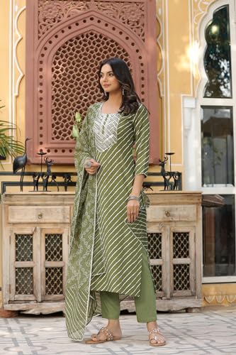 Anni Designer Women'S Cotton Blend Straight Printed Kurta With Pant & Dupatta (Doremi-Green_S_Green_Small),Green,S,Cotton Blend,Regular,