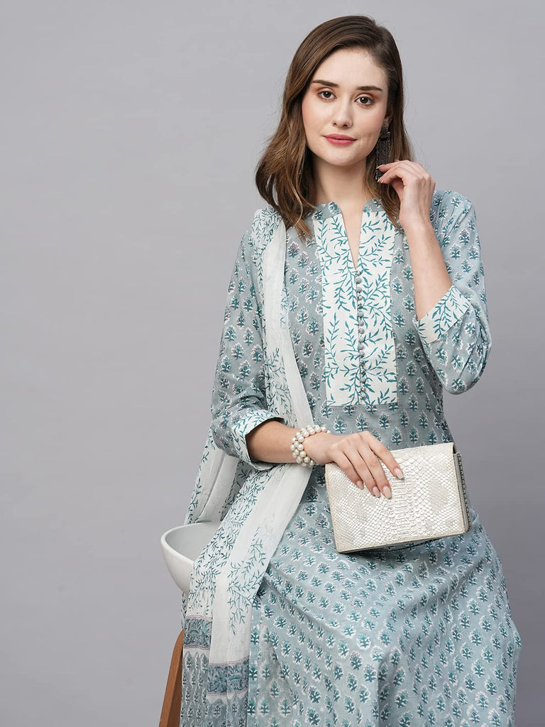 Anni Designer Women'S Cotton Blend Straight Printed Kurta With Pant & Dupatta (Dudu Blue_L_Blue_Large),Blue,L,,,