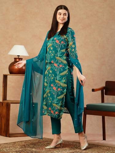 Anni Designer Women'S Cotton Blend Straight Printed Kurta With Pant & Dupatta (Geto Rama-Nw_M_Green_Medium),Green,M,Cotton Blend,Regular,
